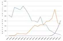 According to the Independent Scientific Committee on Drugs, after mephedrone was made illegal, a street trade in the drug emerged, with prices around double those prior to the ban, at £20–£25 per gram.[102] In September 2010, Druglink reported the ban had a mixed effect on mephedrone use, with it decreasing in some areas, remaining similar in others and becoming more prevalent in some areas.[103] In an online survey of 150 users after the ban, 63% said they were continuing to use mephedrone; of those, half claimed unchanged usage amounts (as to dosage and frequency) and half claimed decreased usage. Compared to previous surveys, more users purchased it from dealers, rather than the internet. The average price per gram was £16, compared to around £10 before the ban.[104] The 2010 Mixmag survey of 2,500 nightclubbers found one quarter had used mephedrone in the previous month, the price had roughly doubled since it was made illegal, and it was more likely to be cut with other substances.[105] Of those who had already used mephedrone prior to the ban, 75% had continued to use it after the ban. Of the various drugs used by the survey participants, users were more likely to have concerns about it.[106] Interviews with users in Northern Ireland also found the price had roughly doubled since it was made illegal, to around £30 a gram. Rather than the price rising due to increased scarcity of the drug, it is thought to have risen for two other reasons. Firstly, dealers knew there was still demand for mephedrone, but were aware the supplies may be exhausted in the future. Secondly, the dealers perceived customers were likely to be willing to pay more for an illegal substance.[11]
