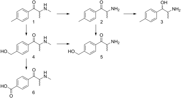 Based on the analysis of rat and human urine by gas chromatography and mass spectrometry, mephedrone is thought to be metabolised by three phase 1 pathways. It can be demethylated to the primary amine (producing compounds 2, 3 and 5), the ketone group can be reduced (producing 3) or the tolyl group can be oxidised (producing 6). Both 5 and 6 are thought to be further metabolised by conjugation to the glucuronide and sulfate derivatives. Knowledge of the primary routes of metabolism should allow the intake of mephedrone to be confirmed by drug tests, as well as more accurate determination of the causes of side effects and potential for toxicity.[43]