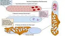 The glomerulus is a tuft of capillaries located within Bowman's capsule within the kidney.[2] Glomerular mesangial cells structurally support the tufts. Blood enters the capillaries of the glomerulus by a single arteriole called an afferent arteriole and leaves by an efferent arteriole.[3] The capillaries consist of a tube lined by endothelial cells with a central lumen. The gaps between these endothelial cells are called fenestrae. The walls have a unique structure: there are pores between the cells that allow water and soluble substances to exit and after passing through the glomerular basement membrane and between podocyte foot processes, enter the capsule as ultrafiltrate.