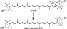 Also, it is possible that meso-zeaxanthin is generated from other carotenoids consumed in the diet, as carotenoids are known to convert into different carotenoids for functional reasons. For example, it has been suggested that meso-zeaxanthin of trout integuments is derived from astaxanthin,[10] and meso-zeaxanthin in primates (macula lutea) is derived (at least in part) from lutein.[5][6]