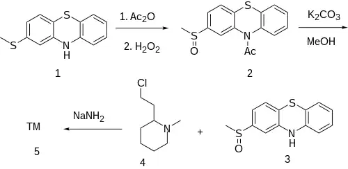 2-Methylthiophenothiazine [7643-08-5] (1) is treated with acetic anhydride] to give the protected amide, ie 10-acetyl-2-methylthiophenothiazine, CID:69367526. Oxidation of this by means of hydrogen peroxide and removal of the acetyl protecting group with potassium carbonate in methanol solution gives 2-methylsulfonylphenothiazine [23503-68-6] (3). Introduction of the sidechain by alkylation with 2-(2-chlorethyl)-1-methylpiperidine [50846-01-0] (6) in the presence of sodamide, afforded the desired mesoridazine (5).