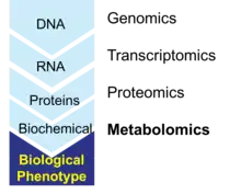 Metabolomics is the scientific study of chemical processes involving metabolites, the small molecule substrates, intermediates, and products of cell metabolism. Specifically, metabolomics is the "systematic study of the unique chemical fingerprints that specific cellular processes leave behind", the study of their small-molecule metabolite profiles.[1] The metabolome represents the complete set of metabolites in a biological cell, tissue, organ, or organism, which are the end products of cellular processes.[2] Messenger RNA (mRNA), gene expression data, and proteomic analyses reveal the set of gene products being produced in the cell, data that represents one aspect of cellular function. Conversely, metabolic profiling can give an instantaneous snapshot of the physiology of that cell,[3] and thus, metabolomics provides a direct "functional readout of the physiological state" of an organism.[4] There are indeed quantifiable correlations between the metabolome and the other cellular ensembles (genome, transcriptome, proteome, and lipidome), which can be used to predict metabolite abundances in biological samples from, for example mRNA abundances.[5] One of the ultimate challenges of systems biology is to integrate metabolomics with all other -omics information to provide a better understanding of cellular biology.