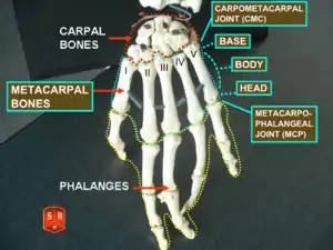 | Articulations | Carpometacarpal, intermetacarpal, metacarpophalangeal |