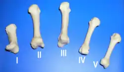 ![]() The five metacarpal bones, numbered. Left hand, anterior (palmar) view. | |