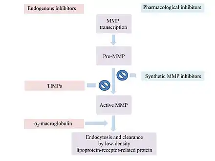 MMP activity is regulated at various levels for example by endogenous inhibitors like α2-macroglobulin and the tissue inhibitors of metalloproteinases (TIMPs).[18]