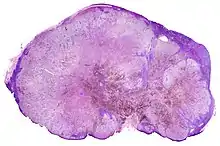 Lymph node with almost complete replacement by metastatic melanoma. The brown pigment is focal deposition of melanin