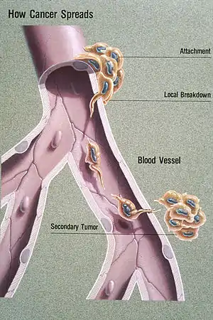 Metastasis is a pathogenic agent's spread from an initial or primary site to a different or secondary site within the host's body;[1] the term is typically used when referring to metastasis by a cancerous tumor.[2] The newly pathological sites, then, are metastases (mets).[3][4] It is generally distinguished from cancer invasion, which is the direct extension and penetration by cancer cells into neighboring tissues.[5]