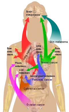 Main sites of metastases for some common cancer types. Primary cancers are denoted by "...cancer" and their main metastasis sites are denoted by "...metastases".[28]