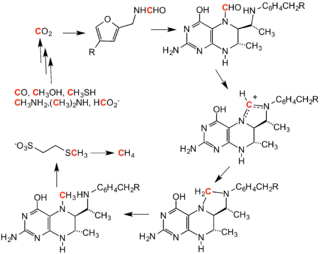 The biochemistry of methanogenesis involves the following coenzymes and cofactors: F420, coenzyme B, coenzyme M, methanofuran, and methanopterin.