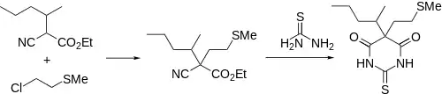A somewhat more complex side chain is incorporated by alkylation of the carbanion of the substituted cyanoacetate (1) with 2-chloroethylmethyl sulfide (2). Condensation of the resulting cyanoester (3) with thiourea followed by hydrolysis of the resulting imine affords methitural.