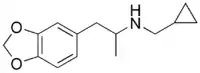 MDCPM, or 3,4-methylenedioxy-N-cyclopropylmethylamphetamine, is a lesser-known psychedelic drug. It is the N-cyclopropylmethyl derivative of MDMA. MDCPM was first synthesized by Alexander Shulgin; it is also one of the compounds delineated in a patent by Horrom in 1972.[1] In his book PiHKAL (Phenethylamines i Have Known And Loved), the minimum dosage is listed as 10 mg, and the duration unknown. MDCPM produces few to no effects. Very little data exists about the pharmacological properties, metabolism, and toxicity of MDCPM.