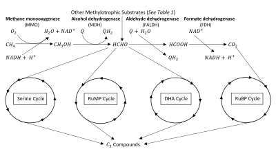 The key intermediate in methylotrophic metabolism is formaldehyde, which can be diverted to either assimilatory or dissimilatory pathways.[2] Methylotrophs produce formaldehyde through oxidation of methanol and/or methane. Methane oxidation requires the enzyme methane monooxygenase (MMO).[3][4] Methylotrophs with this enzyme are given the name methanotrophs. The oxidation of methane (or methanol) can be assimilatory or dissimilatory in nature (see figure). If dissimilatory, the formaldehyde intermediate is oxidized completely into to produce reductant and energy.[5][6] If assimilatory, the formaldehyde intermediate is used to synthesize a 3-Carbon () compound for the production of biomass.[2][7] Many methylotrophs use multi-carbon compounds for anabolism, thus limiting their use of formaldehyde to dissimilatory processes, however methanotrophs are generally limited to only metabolism.[2][5]