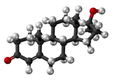 As an AAS, methyltestosterone is an agonist of the androgen receptor (AR), similarly to androgens like testosterone and dihydrotestosterone (DHT).[4][24] It is a substrate for 5α-reductase like testosterone, and so is potentiated analogously in so-called "androgenic" tissues like the skin, hair follicles, and prostate gland via transformation into the more potent AR agonist mestanolone (17α-methyl-DHT).[4][24] As such, methyltestosterone has a relatively low ratio of anabolic to androgenic activity, with a similar ratio to that of testosterone (close to 1:1), and this makes it among the most androgenic AAS.[4][24] Due to efficient aromatization into the potent and metabolism-resistant estrogen methylestradiol (17α-methylestradiol), methyltestosterone has relatively high estrogenicity and hence potential for estrogenic side effects such as gynecomastia and fluid retention.[16][27] The drug possesses negligible progestogenic activity.[4][24]