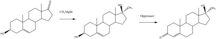 A chemical synthesis of methyltestosterone from dehydroepiandrosterone (DHEA) with methandriol as an intermediate proceeds as follows:[31][32]