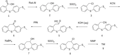 The reduction of 2-(4-methylsulfanylphenyl)sulfanylbenzoic acid, CID:2733664 (1) gives [2-(4-methylsulfanylphenyl)sulfanylphenyl]methanol, CID:12853582 (2). Halogenating with thionyl chloride gives 1-(chloromethyl)-2-(4-methylsulfanylphenyl)sulfanylbenzene, CID:12853583 (3). FGI with cyanide gives 2-[2-(4-methylsulfanylphenyl)sulfanylphenyl]acetonitrile, CID:12853584 (4). Alkali hydrolysis of the nitrile to 2-[2-(4-methylsulfanylphenyl)sulfanylphenyl]acetic acid, CID:12383832 (5). PPA cyclization to 3-methylsulfanyl-6H-benzo[b][1]benzothiepin-5-one, CID:827052 (6). The reduction with sodium borohydride gives 3-methylsulfanyl-5,6-dihydrobenzo[b][1]benzothiepin-5-ol, CID:13597048 (7). Halogenating with a second round of thionyl chloride gives 5-chloro-3-methylsulfanyl-5,6-dihydrobenzo[b][1]benzothiepine, CID:12404411. Alkylation with 1-methylpiperazine [109-01-3] completed the synthesis of Metitepine (9).
