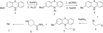 For the first step, 2-Methylthiophenothiazine [7643-08-5] (1) is protected by sequential reaction with sodium amide and acetic anhydride to give 1-[2-(Methylthio)-10H-phenothiazin-10-yl]ethanone [23503-69-7] (2). Oxidation with peracid proceeds preferentially on the more electron-rich alkyl thioether to give the sulfone. Upon hydrolysis of the acetate this affords 2-(methylsulfonyl)-10h-phenothiazine [23503-68-6] (3). Alkylation with 1-Bromo-3-chloropropane (4) gives 10-(3-chloropropyl)-2-methylsulfonylphenothiazine [40051-30-7] (5). Alkylation with piperidine-4-carboxamide (Isonipecotamide) [39546-32-2] (6) affords metopimazine (7).