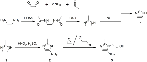 2-Methylimidazole (1) may be prepared via the Debus-Radziszewski imidazole synthesis, or from ethylenediamine and acetic acid, followed by treatment with lime, then Raney nickel. 2-Methylimidazole is nitrated to give 2-methyl-4(5)-nitroimidazole (2), which is in turn alkylated with ethylene oxide or 2-chloroethanol to give metronidazole (3):[64][65][66]