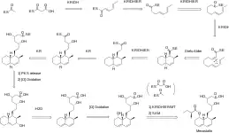Biosynthesis of mevastatin is primarily accomplished via a type 1 PKS pathway it proceeds in the PKS pathway as seen in figure 1 until it reaches a hexaketide state where it undergoes a Diels-Alder cyclization. After cyclization it continues via the PKS pathway to a nonaketide after which it is released and undergoes oxidation and dehydration. It is presumed that the oxidations are preformed by a polypeptide that is similar to cytochrome p450 monooxygenase, which is encoded by mlcC within the mevastatin gene. Lastly the biosynthesis is completed by the PKS facilitating the addition of a diketide sidechain and a methylation by SAM.[7] Figure 1 shows mevastatin in its acid form but it can also be in the more commonly seen lactone form. This pathway was first observed in Penicillium cilrinum and was later discovered that another type of fungus, Penicillium brevicompaetum also produced mevastatin via a PKS pathway.