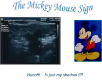 Mickey Mouse sign is a medical sign resembling the head of Mickey Mouse, the Walt Disney character. Presented for the very first time at the CHIVA's Meeting, Berlin 2002 by Dr. Lurdes Cerol, this sign has been described as the image at the groin when a dilated accessory saphenous vein (ASV) exists: the common femoral vein (CFV) represents the head of Mickey Mouse while the great saphenous vein (GSV) and the dilated accessory saphenous vein (ASV) represent the ears. The presence of a Mickey Mouse sign has been a great diagnostic clue to check ASV insufficiency.