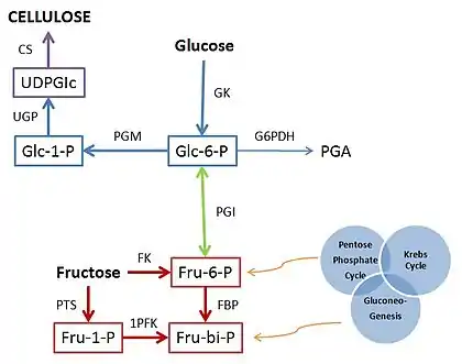 The synthesis of bacterial cellulose is a multistep process that involve two main mechanisms: the synthesis of uridine diphosphoglucose (UDPGIc), followed by the polymerization of glucose into long and unbranched chains (the β-1→4 glucan chain) by cellulose synthase. Specifics on the cellulose synthesis has been extensively documented.[10][11] The former mechanism is well known while the latter still needs exploring. The production of UDPGIc starts with carbon compounds (such as hexoses, glycerol, dihydroxyacetone, pyruvate, and dicarboxylic acids) entering the Krebs cycle, gluconeogenesis, or the pentose phosphate cycle depending on what carbon source is available. It then goes through phosphorylation along with catalysis, followed by isomerization of the intermediate, and a process known as UDPGIc pyrophosphorylase to convert the compounds into UDPGIc, a precursor to the production of cellulose. The polymerization of glucose into the β-1→4 glucan chain has been hypothesized to either involve a lipid intermediate[12] or not to involve a lipid intermediate,[10] though structural enzymology studies and in vitro experiments indicate that polymerization can occur by direct enzymatic transfer of a glucosyl moiety from a nucleotide sugar to the growing polysaccharide.[13] A. xylinum usually converts carbon compounds into cellulose with around 50% efficiency.[12]