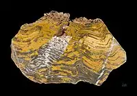 Microbialites are made up of layers made up of an organic component and another mineral.[9] The organic component is an elaborate microbial mat where different communities of microorganisms interact with different metabolisms and create a micro-niche where oxygenic and anoxygenic phototrophic organisms coexist, nitrogen fixers, sulfur reducers, methaneotrophs, methanogens, iron oxidizers, and an infinity of heterotrophic decomposers.[10] The mineral component is composed of carbonates, generally calcium carbonate or magnesium carbonates such as hydromagnesite, although there may also be sintered silicones, that is, silicates and include mineral forms of sulfur, iron (pyrite) or phosphorus.[11] Carbonate is usually a type of autogenic automicrite, therefore it precipitates in situ. Microbialites can be viewed as a type of biogenic sedimentary rock where the reef builders are microbes and carbonate precipitation is induced. Microorganisms can precipitate carbonate in both shallow and deep waters