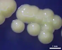 Micrococcus luteus is a Gram-positive to Gram-variable, nonmotile, tetrad-arranging, pigmented, saprotrophic coccus bacterium in the family Micrococcaceae.[1] It is urease and catalase positive. An obligate aerobe, M. luteus is found in soil, dust, water and air, and as part of the normal microbiota of the mammalian skin. The bacterium also colonizes the human mouth, mucosae, oropharynx and upper respiratory tract.