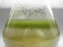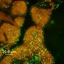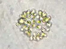 As the etymological derivation implies, Microcystis is characterized by small cells (a few micrometers in diameter), possessing gas-filled vesicles (also lacking individual sheaths).[2] The cells are usually organized into colonies (aggregations of which are visible with the naked eye) that begin in a spherical shape, losing coherence to become perforated or irregularly shaped over time. These colonies are bound by a thick mucilage composed of complex polysaccharide compounds, including xylose, mannose, glucose, fucose, galactose, and rhamnose, among other compounds.[3]
