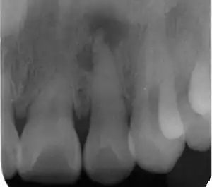 | Radiograph (X-ray) showing microdontia. Note also periapical lesion on the maxillary left lateral incisor. | |