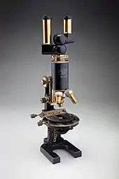Although objects resembling lenses date back 4,000 years and there are Greek accounts of the optical properties of water-filled spheres (5th century BC) followed by many centuries of writings on optics, the earliest known use of simple microscopes (magnifying glasses) dates back to the widespread use of lenses in eyeglasses in the 13th century.[2][3][4] The earliest known examples of compound microscopes, which combine an objective lens near the specimen with an eyepiece to view a real image, appeared in Europe around 1620.[5] The inventor is unknown, even though many claims have been made over the years. Several revolve around the spectacle-making centers in the Netherlands, including claims it was invented in 1590 by Zacharias Janssen (claim made by his son) or Zacharias' father, Hans Martens, or both,[6][7] claims it was invented by their neighbor and rival spectacle maker, Hans Lippershey (who applied for the first telescope patent in 1608),[8] and claims it was invented by expatriate Cornelis Drebbel, who was noted to have a version in London in 1619.[9][10] Galileo Galilei (also sometimes cited as compound microscope inventor) seems to have found after 1610 that he could close focus his telescope to view small objects and, after seeing a compound microscope built by Drebbel exhibited in Rome in 1624, built his own improved version.[11][12][13] Giovanni Faber coined the name microscope for the compound microscope Galileo submitted to the Accademia dei Lincei in 1625[14] (Galileo had called it the occhiolino 'little eye').
