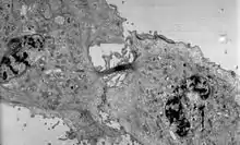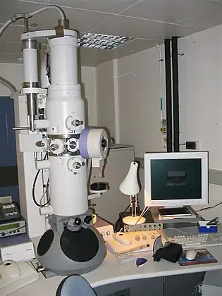 The two major types of electron microscopes are transmission electron microscopes (TEMs) and scanning electron microscopes (SEMs).[20][21] They both have series of electromagnetic and electrostatic lenses to focus a high energy beam of electrons on a sample. In a TEM the electrons pass through the sample, analogous to basic optical microscopy.[20] This requires careful sample preparation, since electrons are scattered strongly by most materials.[21] The samples must also be very thin (below 100 nm) in order for the electrons to pass through it.[20][21] Cross-sections of cells stained with osmium and heavy metals reveal clear organelle membranes and proteins such as ribosomes.[21] With a 0.1 nm level of resolution, detailed views of viruses (20 – 300 nm) and a strand of DNA (2 nm in width) can be obtained.[21] In contrast, the SEM has raster coils to scan the surface of bulk objects with a fine electron beam. Therefore, the specimen do not necessarily need to be sectioned, but coating with a nanometric metal or carbon layer may be needed for nonconductive samples.[20] SEM allows fast surface imaging of samples, possibly in thin water vapor to prevent drying.[20][21]
