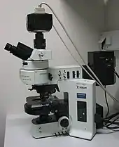The most recent developments in light microscope largely centre on the rise of fluorescence microscopy in biology.[20] During the last decades of the 20th century, particularly in the post-genomic era, many techniques for fluorescent staining of cellular structures were developed.[20] The main groups of techniques involve targeted chemical staining of particular cell structures, for example, the chemical compound DAPI to label DNA, use of antibodies conjugated to fluorescent reporters, see immunofluorescence, and fluorescent proteins, such as green fluorescent protein.[21] These techniques use these different fluorophores for analysis of cell structure at a molecular level in both live and fixed samples.