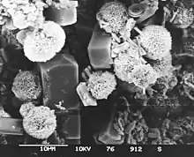 - Grobe/AWI, Hannes (1980-04-07), SEM photomicrograph of Arnager Kalk ("Arnager Limestone") from the Upper Cretaceous of Bornholm, Denmark: close up of prismatic crystals and spheroidal aggregates of unidentified authigenic minerals., retrieved 2022-05-27
