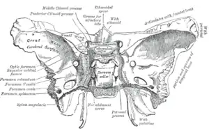 ![]() Sphenoid bone. Upper surface. (Middle clinoid process labeled at upper left.) | |
