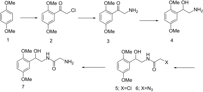 Acylation of 1,4-dimethoxybenzene with chloroacetyl chloride gives the chloroketone 2. The halogen is then converted to the amine 3 by any set of standard schemes, and the ketone reduced to an alcohol with borohydride (4).[15] Acylation of the amino group in this last intermediate with chloroacetyl chloride affords the amide 5. The halogen is then displaced with azide and the resulting product 6 reduced catalytically to the glycinamide, midodrine (7).[16]