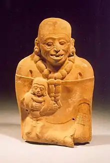 In Maya society, it is believed that midwives receive their calling from God in a series of dreams. These visions are believed to often include subtle hints that a woman is destined to become a midwife and can include visions of Saint Anne who is the saint of all midwives.[2] According to the Mayan religion, in addition to receiving dreams and visions, women also tend to find small items in paths that are symbols and objects related to midwifery. The objects are often small unusual stones that resemble the shape of a face, shells, marbles or broken fragments of archaeological figurines.[3] Stones are often given sacred powers in the Maya religion and are believed to be sent from the spiritual world as a sign of one's calling to midwifery.[2] It is also believed that some objects left in a midwife's path may also be the tools they need to perform parts of the birthing, i.e. a penknife that is used to cut the umbilical cord. Women often consult shamans who explain their calling to them, and after the women accept that they are to become midwives, they are believed to receive another series of dreams and visions regarding the birthing practices they must follow. In addition to these special objects, and the repetitious dreams, it is believed that they may also be summoned to mountains or other sacred places where they may encounter supernatural beings.[3] Mayans believe that women who ignore their calling often fall ill, and if doctors are unable to determine a diagnosis for their ailments, they may even face death. They also believe that they are told in their dreams by supernatural beings that they will receive gifts from the families of the children they deliver and that they must not be greedy because many will give what they have it must be accepted with a goodness of heart.[4]