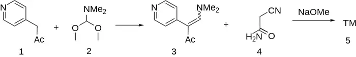 The reaction between 4-methylpyridine and methyl acetate gives 4-pyridyl acetone (4-acetonylpyridine) [6304-16-1] (1). The Knoevenagel condensation type reaction between this and DMF-dimethylacetal [4637-24-5] (2) affords CID:3018775 (3). Then base catalyzed reaction of this with cyanoacetamide (4) completes the synthesis of milrinone (5).