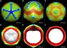 The coloring is based on radial distance from the center of the virus