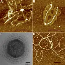 Its capsid appears hexagonal under an electron microscope, therefore the capsid symmetry is icosahedral.[12] It does not appear to possess an outer viral envelope, suggesting that the virus does not exit the host cell by exocytosis.[13] Mimivirus shares several morphological characteristics with all members of the NCLDV group of viruses. The condensed central core of the virion appears as a dark region under the electron microscope. The large genome of the virus resides within this area. An internal lipid layer surrounding the central core is present in all other NCLDV viruses, so this features may also be present in mimivirus.[12]