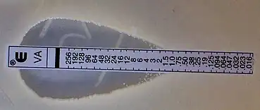 Etests can be used as an alternative method to determine the minimum inhibitory concentrations of a wide range of antimicrobial agents against different organisms. They have been widely used in microbiology laboratories around the world. Manufactured by bioMérieux, Etests are a ready-to-use, non-porous plastic reagent strip with a predefined gradient of antibiotic, covering a continuous concentration range.[24]