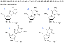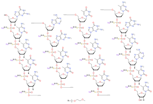The compound is a 'second-generation' antisense oligonucleotide; the nucleotides are linked with phosphorothioate linkages rather than the phosphodiester linkages of RNA and DNA, and the sugar parts are deoxyribose in the middle part of the molecule and 2’-O-methoxyethyl-modified ribose at the two ends. These modifications make the drug resistant to degradation by nucleases, allowing it to be administered weekly.