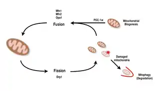 Mitochondria are highly versatile and are able to change their shape through fission and fusion events.[9][8] Definitively, fission is the event of a single entity breaking apart, whereas fusion is the event of two or more entities joining to form a whole.[8] The processes of fission and fusion oppose each other and allow the mitochondrial network to constantly remodel itself.[9][8] If a stimulus induces a change in the balance of fission and fusion in a cell, it could significantly alter the mitochondrial network.[9][13] For example, an increase in mitochondrial fission would create many fragmented mitochondria, which has been shown to be useful for eliminating damaged mitochondria and for creating smaller mitochondria for efficient transporting to energy-demanding areas.[13][14] Therefore, achieving a balance between these mechanisms allows a cell to have the proper organization of its mitochondrial network during biogenesis and may have an important role in muscle adaptation to physiological stress.[13]