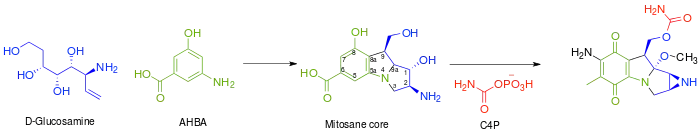 The mitosane core is synthesized as shown below via condensation of AHBA and D-glucosamine, although no specific enzyme has been characterized that mediates this transformation. Once this condensation has occurred, the mitosane core is tailored by a variety of enzymes. Both the sequence and the identity of these steps are yet to be determined.