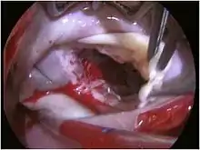 ![]() Base of ventricles exposed by removal of the atria. (Bicuspid (mitral) valve visible at bottom left.