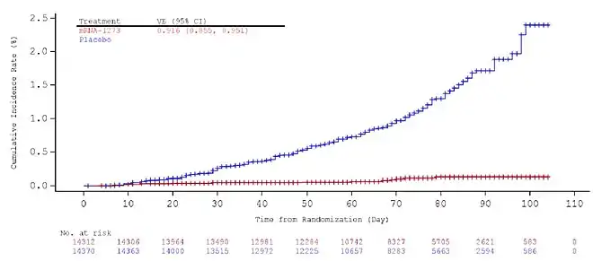In February 2021, results from phase III clinical trial were published in the New England Journal of Medicine, indicating 94% efficacy in preventing COVID19 infection.[47][110][141] Side effects included flu-like symptoms, such as pain at the injection site, fatigue, muscle pain, and headache.[110] The clinical trial is ongoing and is set to conclude in late 2022.[142]