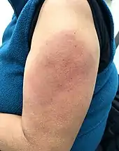 The US Centers for Disease Control and Prevention (CDC) has reported anaphylaxis (a severe allergic reaction) in 2.5 cases per million doses administered and has recommended a 15-minute observation period after injection.[86] Delayed cutaneous reactions at injection sites resulting in rash-like erythemas have also been observed in rare cases but are not considered serious or contraindications to subsequent vaccination.[87] The incidence rate for local adverse erythema is about 10.8%, in 1.9% of cases redness may extend to a size of 100 mm or greater.[36]