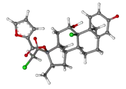Mometasone by itself is a synthetic, steroidal glucocorticoid or corticosteroid that was never marketed.[31][32][33] The C17α furoate ester of mometasone, is the marketed medication.[31][32][33] Mometasone furoate acts as a prodrug of mometasone.[34] In addition to its glucocorticoid activity, mometasone also has very potent progestogenic activity and acts as a partial agonist of the mineralocorticoid receptor.[28]