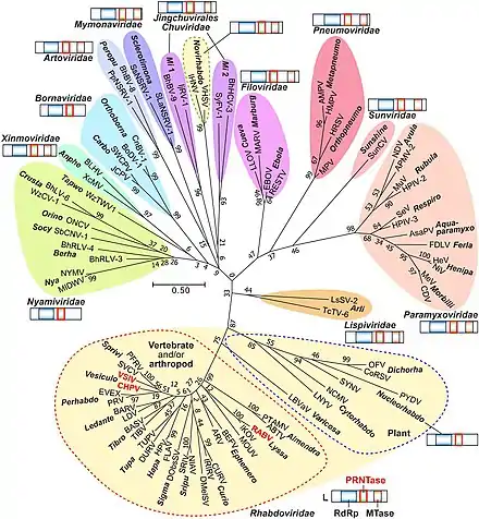 - Wolf, Yuri; Krupovic, Mart; Zhang, Yong Zhen; Maes, Piet; Dolja, Valerian; Koonin, Eugene V.; Kuhn, Jens H. "Megataxonomy of negative-sense RNA viruses". International Committee on Taxonomy of Viruses (ICTV). Archived from the original (docx) on January 13, 2019. Retrieved 12 January 2019.