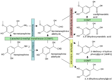- Adrenaline or noradrenaline to 3,4-Dihydroxymandelic acid