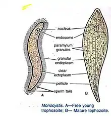 The mature adult of Monocystis is a feeding stage called a trophozoite. The young trophozoite lives in the sperm morula (group of developing sperm) of the host; it feeds and grows at the expense of the protoplasm of the developing sperm until all the protoplasm is exhausted and it is surrounded by the tails of the dead sperm cells. In this stage, it is sometimes mistaken for a ciliated organism, but the sperm tails soon detach from its body and the trophozoite becomes free.[2] The adult is an elongated, spindle-shaped, flattened, wormlike creature. Its body is covered by a thick, smooth, and permeable pellicle. The cytoplasm is well differentiated into ectoplasm and endoplasm, the latter containing a large vesicular nucleus. Its nutrition is sporozoic. There are no locomotory organs, but it shows wriggling and gliding movements.