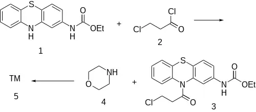 The amide formation between Phenothiazine-2-ethylcarbamate [37711-29-8] (1) and 3-Chloropropionyl chloride [625-36-5] (2) gives ethyl N-[10-(3-chloropropanoyl)phenothiazin-2-yl]carbamate [119407-03-3] [34749-22-9] (3). Displacement of the remaining ω-halogen by morpholine (4) then completes the synthesis of Moricizine (5).